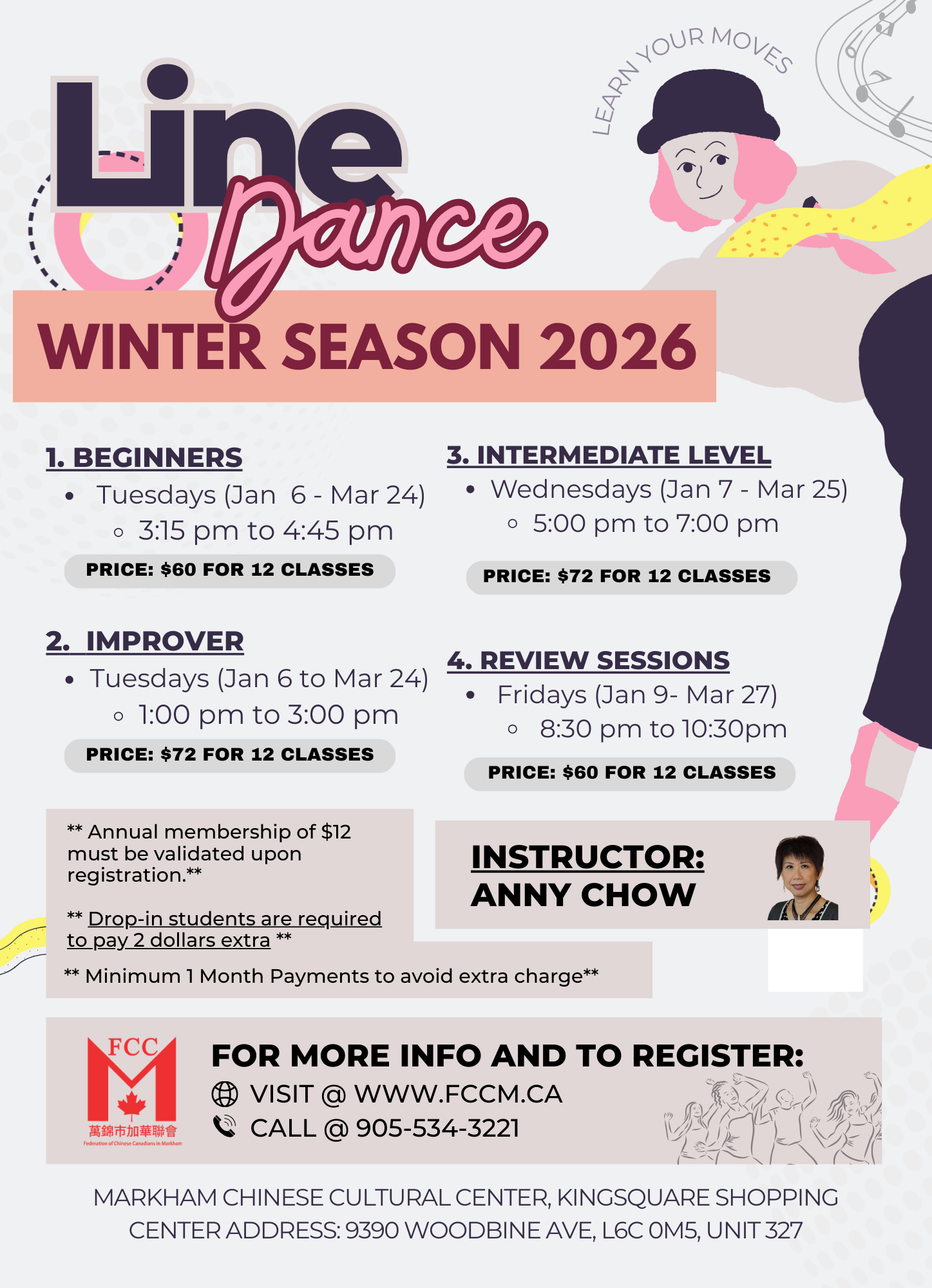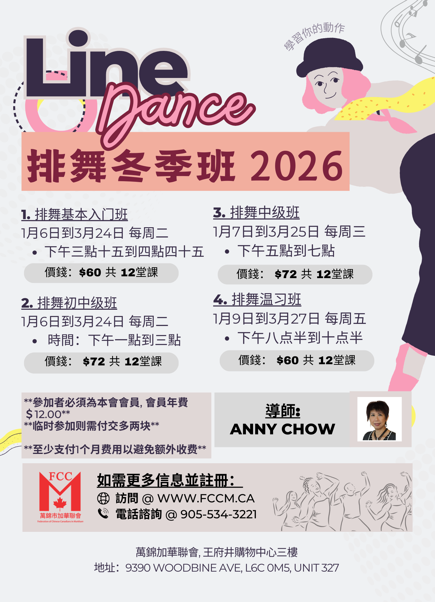 FCCM Line Dance classes, led by instructor Anny Chow, help adults in Markham stay active, improve coordination, and meet new friends in a fun, welcoming environment.